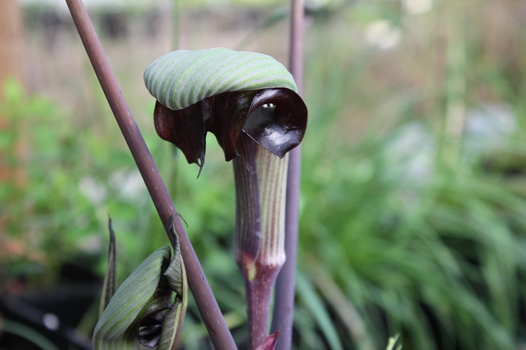 There is a tiny plant of Arisaema ringens outside. It was a small division of the plant in the greenhouse when it went out, and it is still a small thing.