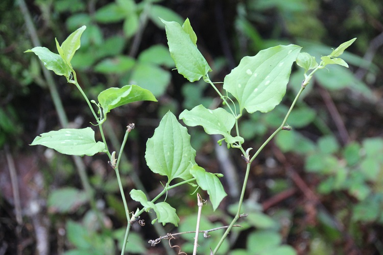 It went out under a small evergreen, hoping that it would get some protection and sprawl upwards in a supported way. Not to be, I never saw it again. Crug Farm Plants say in their catalogue "Scandent to climbing deciduous sub-shrub with angled prickly branching stems to 5m long, with parchment textured heart-shaped leaves somewhat glossy above to 12cm long. With tendrils on their petioles (leaf stalk) and axillary simple loose umbells of greenish white flowers borne in May-June, followed by the autumn with globose black fruit. One of our seed collections gathered in the Waraksan area of central South Korea in the autumn of 2010. Easily grown in most types of fertile drained soils in either sun or shade." The Flora of China says: "Forests, thickets, grassy slopes; near sea level to 1800(--2500) m. Anhui, Fujian, Jiangsu, Liaoning, Shandong, Taiwan, Zhejiang [Japan, Korea]." Trees and Shrubs online says: "A deciduous or semi-evergreen species, the stems round or somewhat ribbed, and more or less armed with slender prickles; branches distinctly angular. Leaves ovate with a heart-shaped base and a long fine point, five-or seven-nerved, margins minutely jagged; green both sides, 11⁄2 to 3 in. long, two-thirds as wide. Flowers in small umbels of four to seven blossoms, green; main flower-stalk 1⁄2 to 5⁄8 in. long. Berries black, 1⁄4 in. wide, often in threes. Native of Japan, Korea, China and Formosa; introduced in 1908, perhaps before. It is a little known species in gardens, very distinct from S. china, which also occurs in Japan, in the smaller, black fruits, fewer flowered umbels, and triangular-ovate leaves." |