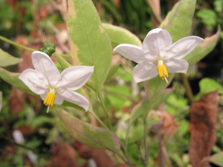 "Easy to please potato relative Solanum laxum 'Aureovariegatum' has creamy yellow-margined leaves, crowned with clusters of white flowers.