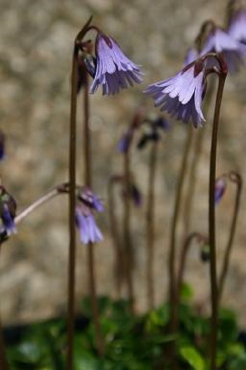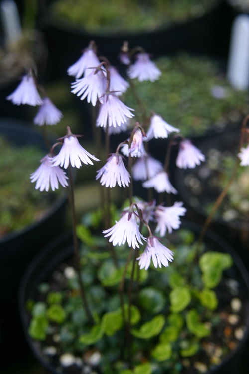 A vigorous hybrid Soldanella that has more than repaid the tiny effort of growing it. Some of the species are rather shy to flower. I bought it from Blackthorn Nursery and their label says: "This form seems very free flowering and worth a try in a rock garden or trough away from full sun. Protect from slugs." Farmyard Nurseries say: "A wonderful little plant having a special grace all of its own, almost a magical touch. Mats of dark evergreen rounded leaves provide the perfect foil for small clusters of nodding lilac or white frilly flowers. Good in shade. Height 10cm (4 inches) Spread 30cm (1′)." |