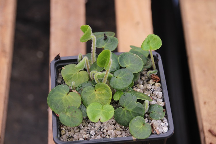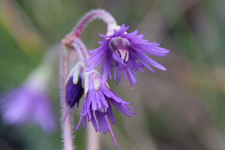 It always seems quite coarse to me, although it is a grossly unfair thing to say about such a tiny plant. I bought it from Triffids Nursery, their label says: "Fringed purple flowers April-May. Shade loving alpine. Needs well dained soil in light shade 6in." Dan Hinkley said in the Heronswood catalogue (2000): "An undemanding species that, though recommended as an ideal bog plant, thrives in our relatively dry woodland, where in early spring nodding and fringed violet flowers are produced on 8in stems above mounds of rounded, evergreen foliage. Will ultimately spread by stolons to produce sizable colonies." |