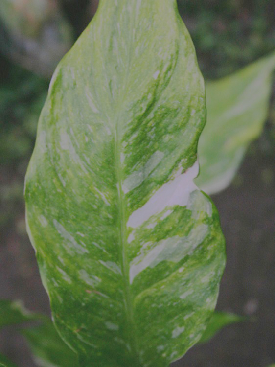 it turns out that it isn't particularly cold tolerant. In the conservatory the white parts were rapidly killed by low temperatures, promptly followed by the green! Glasshouseworks said in their catalogue for 2000; "We have various "Variegated Peace Lily" selections, but this is the most vibrantly streaked, mottled, richly colored one of all - with compact clumping habit. Super." The plant is protected by US Plant Patent no. 9,944 (July 1997). The patent says: "The new cultivar was discovered by the inventor [Daniel Cornelis] in Merelbeke, Belgium, as a spontaneous mutation in a large population of plants of the cultivar Daniel (disclosed in U.S. Plant Pat. No. 8,655). The new cultivar was identified as a single plant within this population of plants of the cultivar Daniel that consistently had variegated leaves compared to plants of the cultivar Daniel that had non-variegated leaves." |