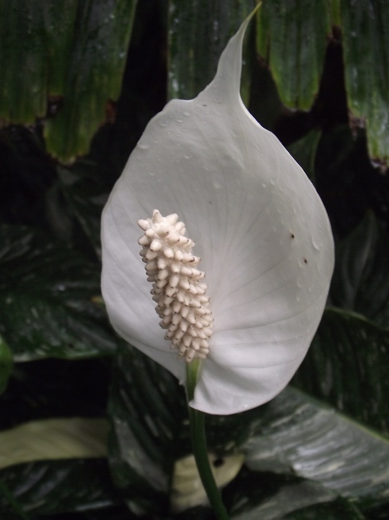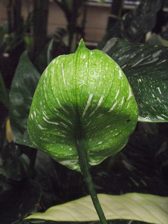 Spathiphyllum make striking houseplants, and are now mass produced by tissue culture, which is where this variegated form appeared. Novel rather than beautiful,