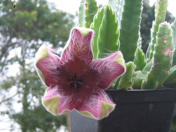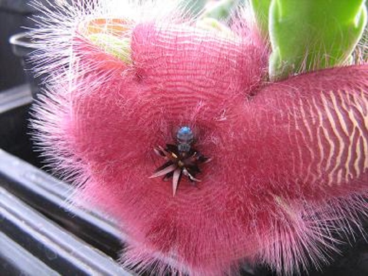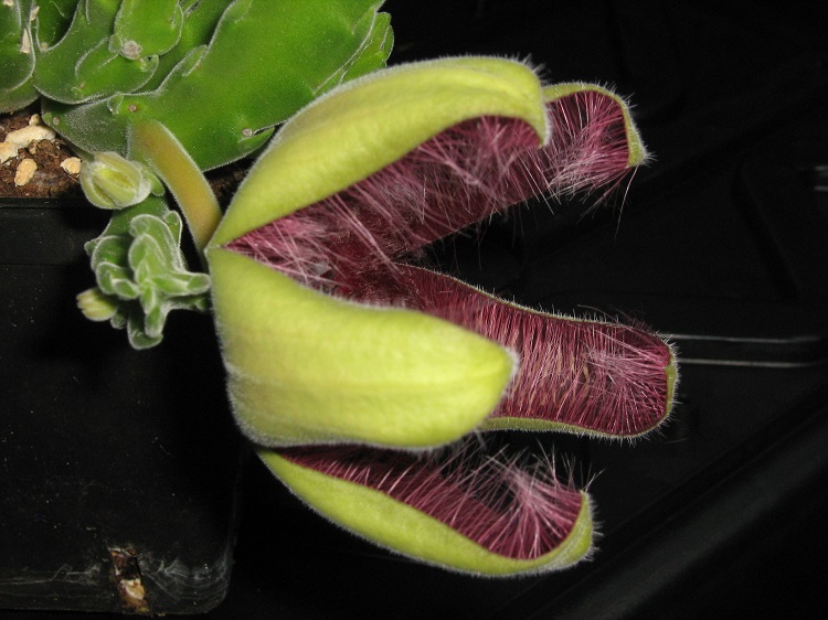 I didn't find the smell too offensive, but I only went out to the greenhouse in the evening when it started to cool. Originally introduced as S. flavirostris, it is now seen as part of the variation within S. grandiflora. The use of the cultivar name 'Flavirostris' is a nomenclatural kindness for the confused. Llifle says: "Stapelia grandiflora is a tufted cactus-like plant with large and showy star-fish shaped flowers. Stapelia grandiflora is a very variable species with many hybrids both in the wild and in cultivation. This specie meets and intergrade with Stapelia hirsuta in the little Karoo and the two (quite similar) species can be separated by its thicker pedicel. It is a relatively large, perennial, stem succulent that can form large compact clusters up to 50 cm in diameter (or more). Flowers are intermittently produced throughout the late summer and autumn. Flies pollinate the flowers resulting in the typical twin seed horns (follicles), which are decorative in themselves and often don't appear until a year later." |