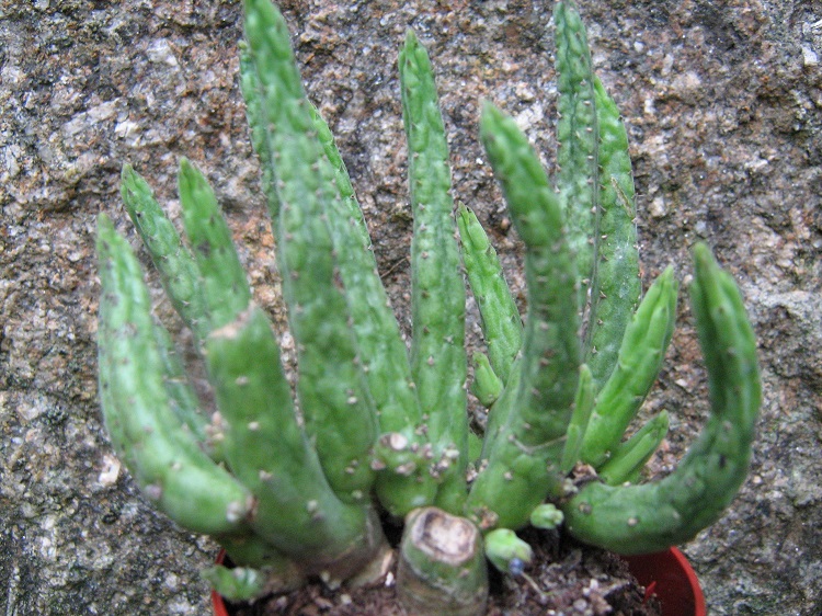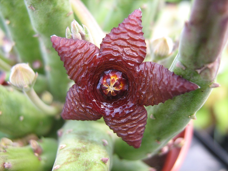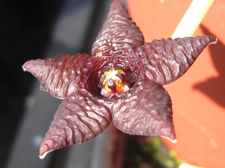 A small growing species with very dark flowers, produced freely throughout the summer months. It survived the first winter with me, despite taking some damage, but died in the second. Llifle Encyclpedia of Living Forms says: "Stapelia similis is commonly found in Namibia and the Northern Cape Province (northern Richtersveld) 200-1600 metres above sea level. Stapelia similis is a tufted cactus-like plant with small-sized and showy dark purple star-fish shaped flowers. It is a variable species with several forms both in the wild and in cultivation. Stapelia similis the “similar Stapelia” reflects in its name the close relationships in appearance it has with Stapelia kwebensis, Stapelia kwebensis var. longipedicellata and Stapelia parvula along with it forms a closely related group. Flies pollinate the flowers resulting in the typical twin seed horns (follicles), which are decorative in themselves and often don't appear until a year later. Flowers are intermittently produced throughout the late summer and autumn. |
