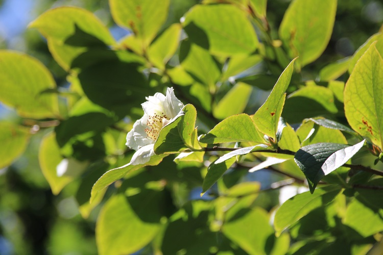 it is a tree that I admire and planting a tiny sapling was the best way to achieve that. My youngster was pot grown and almost as soon as it was planted out it produced a premature flower which was worth photographing even in this rather tatty state. It will be several years before it produces another. I had to wait until 2019 for a repeat flowering. It is out of reach, but worth a distant picture. When I first planted it I was worried that the wind in the garden would be too severe, but the plant has grown sturdily and proved me wrong. Trees and Shrubs online says: "The first material of S. pseudocamellia to be introduced from Korea was seed collected on Chiri San, by Ernest Wilson in 1917, and cultivated at the Arnold Arboretum, where original trees still grow. It was admired there in 1930 by Arthur Osborn of Kew, and material reached England in the following year (Bean 1981). It rapidly became popular and plants of Korean lineage may now have supplanted Japanese stock in general cultivation (Hsu, Boland & Camelbeke 2008). Perceived small differences led to it being described as distinct, and a succession of synonyms has been applied, but it is generally considered that there are no significant distinctions between Japanese and Korean plants. There is some merit in recording the origin for horticultural purposes, however, as Korean trees may be slightly shorter, and are said to have flowers that open more widely than those from Japan; particularly good red autumn colours are also claimed for them (Armitage, Edwards & Lancaster 2014). As they are usually raised from seed they are best treated under the name Koreana Group – which has also been granted the RHS Award of Garden Merit. It has been reintroduced on several occasions in more recent times." The North Carolina Extension GHardener Toolbox says: "The Japanese Stewartia is a small to medium-sized deciduous flowering tree with multi-season interest. It is multistemmed and pyramidal to oval-shaped with low branches. The plant may reach a height of 12 to 40 feet tall and 8 to 25 feet wide. White Camellia-like flowers appear from June to August, and the fall foliage has bright colors. The attractive flaking and peeling bark adds a special interest to the winter garden. The plant is a member of the Theaceae family and is related to the Camellia. The genus's name, Stewartia, is in honor of John Stuart who was a 16th-century Scottish botanist. The spelling was the result of a transcription error. During the 19th-century, the name Stuartia was used; however, the original spelling is now accepted. The species name, pseudocamellia, means "false camellia." |