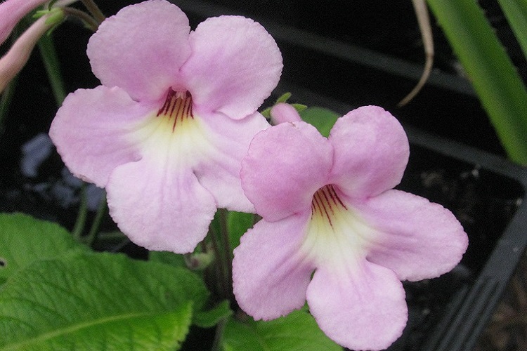 to take a winter in the greenhouse. Dibleys catalogue says: "The flowers are pale pink when they first open, darkening to a mid pink after a couple of days. The throat is a strong yellow which extends over the lower lobes, overlaid with 7 short purple lines. The habit is very similar to its sister plant 'Hope'. Flower size 4.8cm. Flowers March-November. Height 11-20cm." |