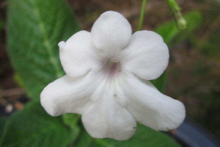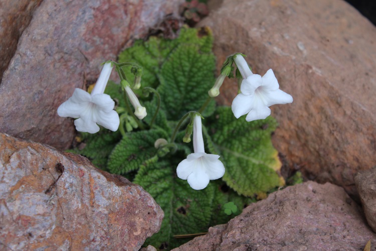 A pretty species that could possibly be cold hardy. I have planted it in the Agave house where the cold is not usually severe though it might be too dry. I bought it from Dibleys and their Catalogue entry says: "A medium sized plant with broad leaves. The white flowers have a silvery sheen on the lobes. The throat is purple with two very distinct yellow bars. This is another species with honey scent." Plantzafrica says: "A lovely, neat, pretty species of Streptocarpus that has flat-growing, rough leaves and delicate flowing stems presenting white flowers with a violet blush and two light yellow stripes in the mouth of each flower. The flower usually has a single or split, yellow stripe on the floor of the corolla tube, with the violet colour within the flower throat and at the noticeably narrow mouth of the flower, varying from being absent, to pale violet, to a deep vibrant violet colour, with speckles or spreading streaks extending out along the petals. Fruits are spirally twisted, slender, pod-like capsules, filled with masses of minute seeds. Occurs naturally in more exposed habitats on mountainous aspects yet still protected and shaded within rock cracks and fissures, or on south-facing rock walls and steep soil slopes in the Baviaanskloof Mountains in the Eastern Cape and in Mpumalanga Province. Streptocarpus meyeri is a plant that is seldom seen in gardens due to its unavailability in the trade and because it can be challenging to grow in home garden conditions. Brian Laurence Burtt, who named and described this species, was an English botanist and taxonomist who is known for his substantial contributions to the family Gesneriaceae." In Streptocarpus, Hilliard and Burtt say: "S.meyeri ia a plant of open situations. It favours steep faces against which the rosettes are often pressed flat with the rhizomes wedged into the hard earth or rock faces. In the Cape, it often grows on the shady side of rock outcrops on hillsides or on cliffs and steep earth banks. It is one of the few species of Streptocarpus with a disjunct distribution. The Transvaal colonies are separated by some 500 miles (800km) from the main area of the species in the eastern Cape. The intervening country has been sufficiently well collected to make it unlikely that this gap is anything but a real one. Characteristic features that combine to make S. meyeri easily recognised are the relatively narrow corolla tube, deep violet on the outside, and the almost regular white limb." |