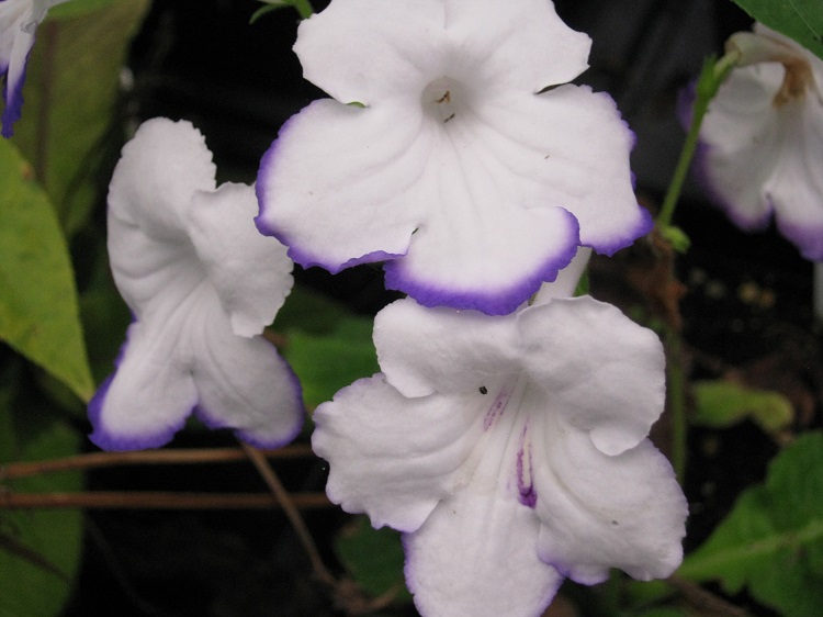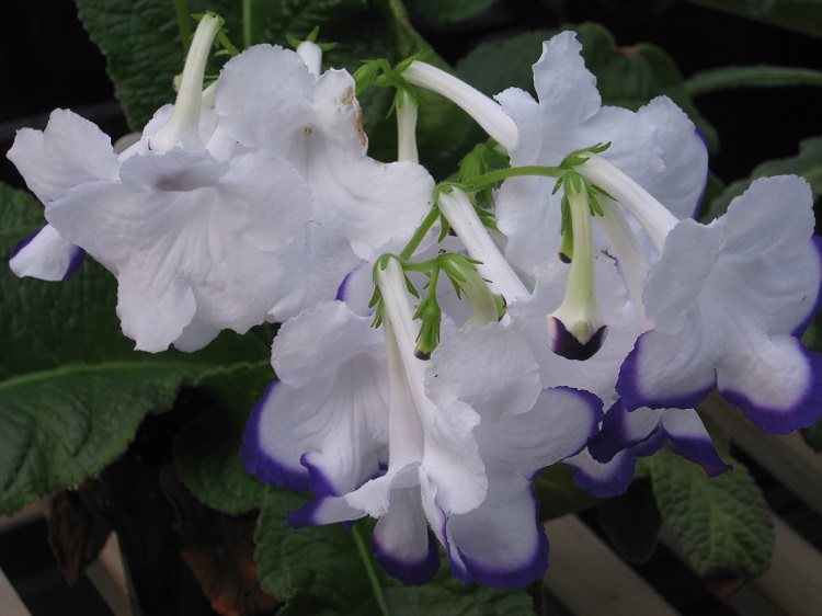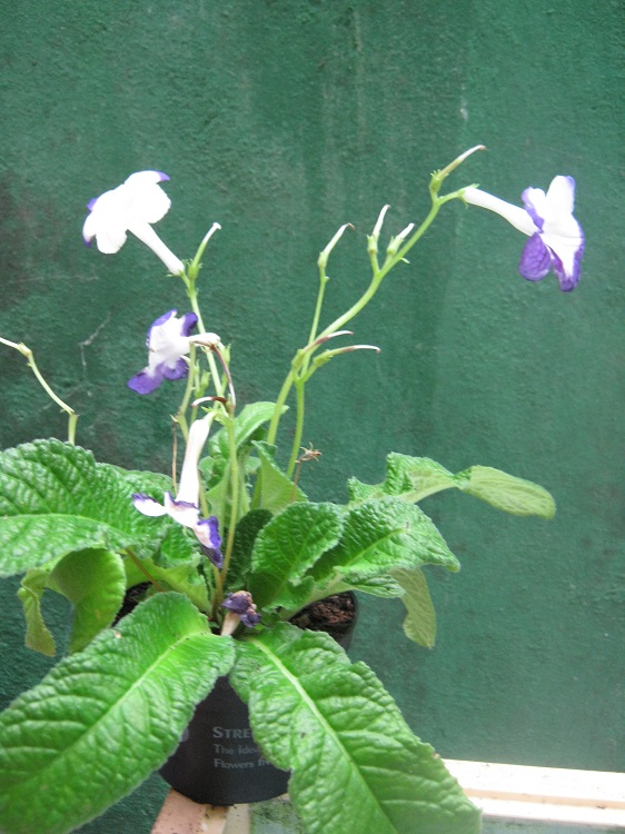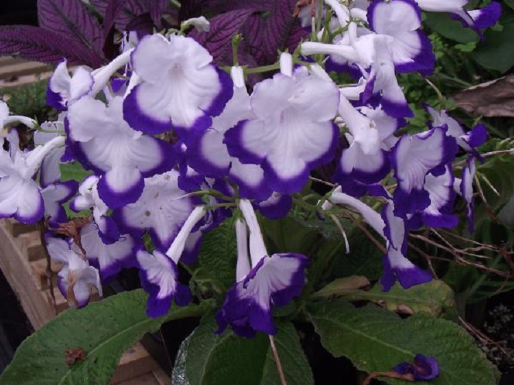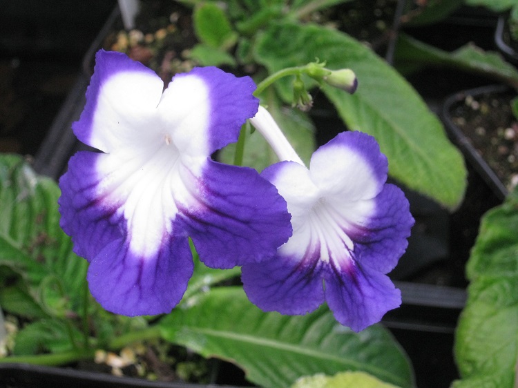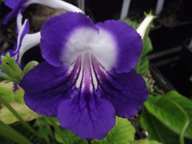 is out there at the moment) and then forget to bring it in again in the autumn. Raised by Fleischle Gartenbau in Germany. Dibleys catalogue says: "Fantastic markings on this variety make it stand out from other plants, a large white circle is superimposed over rich royal blue edges. A free flowering variety with compact leaves. (Fleischle)" |