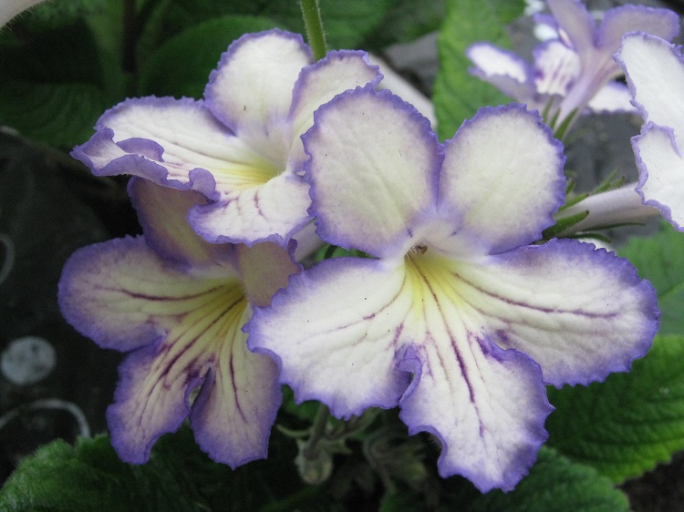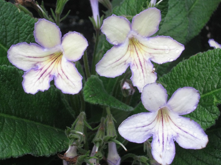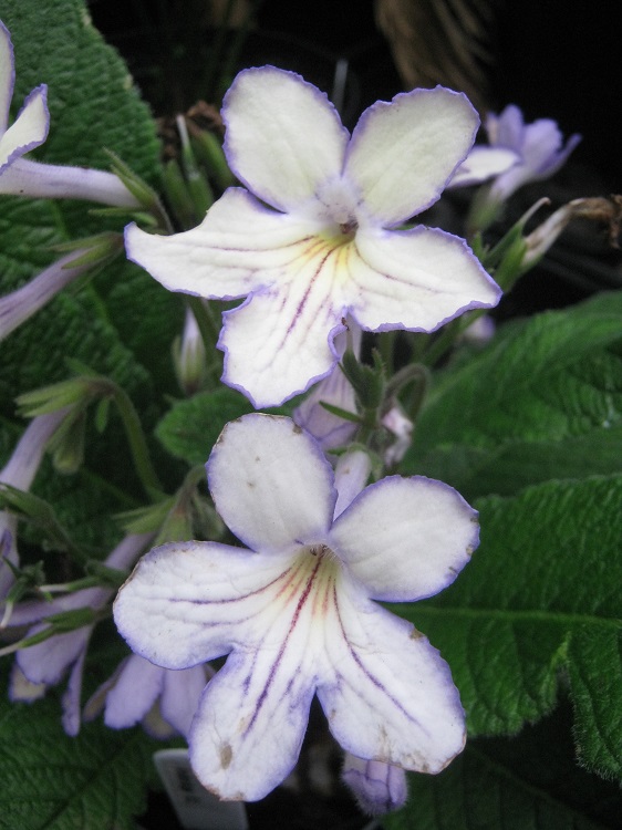 A complex flower colour, I was given a leaf in 2010. Raised by Dibleys. Their catalogue says: "A new colour break; strong yellow background with inky blue veins and violet-blue edging. A plant of compact habit which flowers freely for 10 months. In "Plant Forum" in the JRHS the writer says: "The initial cross of this new Streptocarpus from Dibley's Nurseries was made in 1995. Finally, eight generations and 3,000 seedlings later, the nursery has introduced Streptocarpus 'Seren', a new colour break capable of flowering for more than 10 months of the year." |