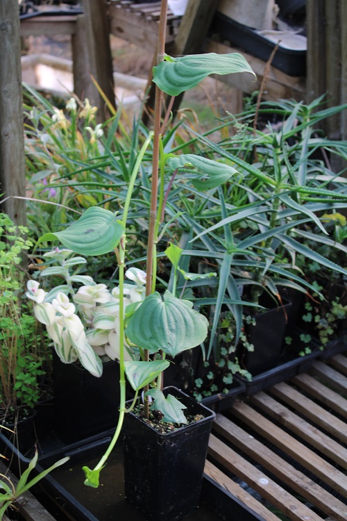 A curious herbaceous climber. It spends the winter as a gorgeous leafy ground cover and then grows long vining stems in the warmth of summer.