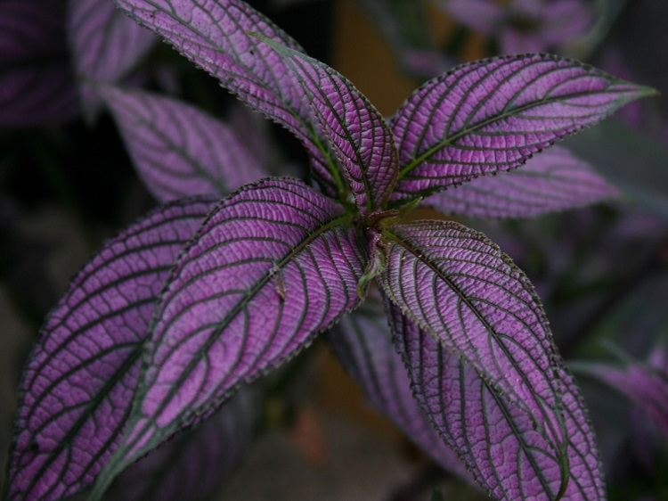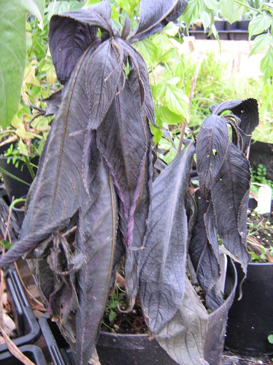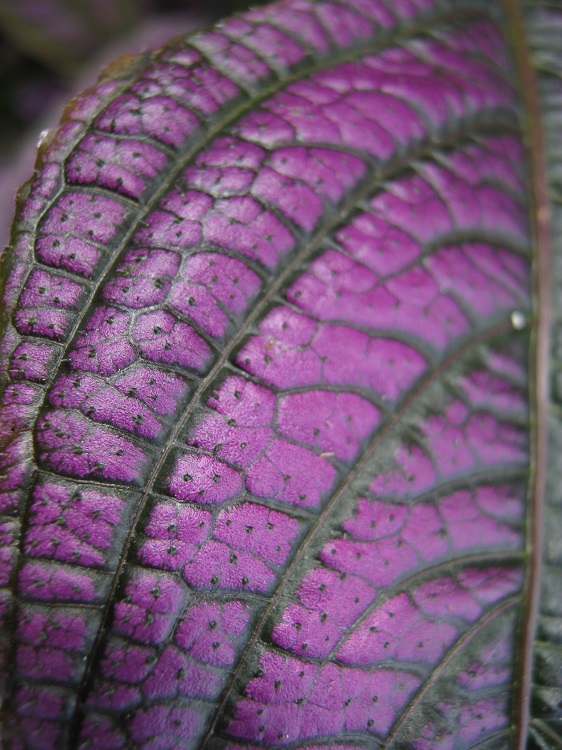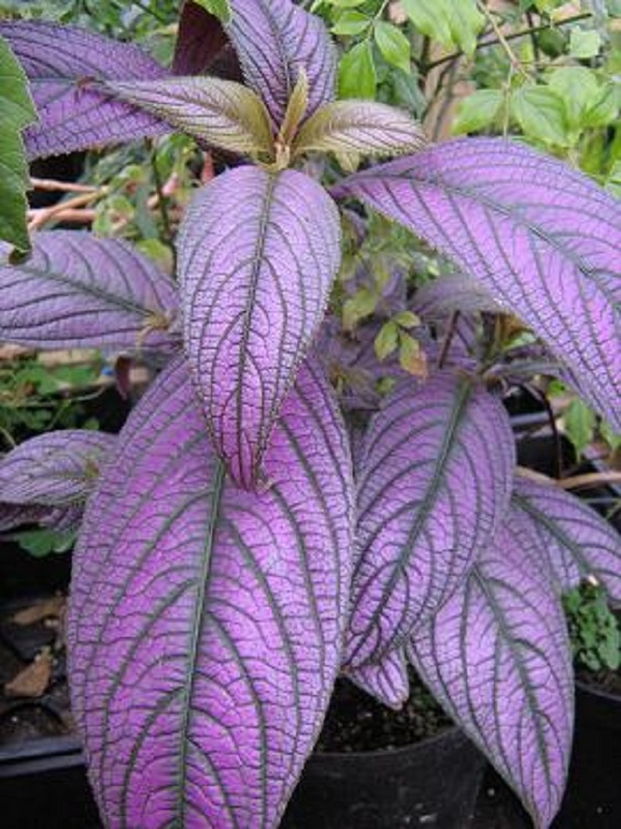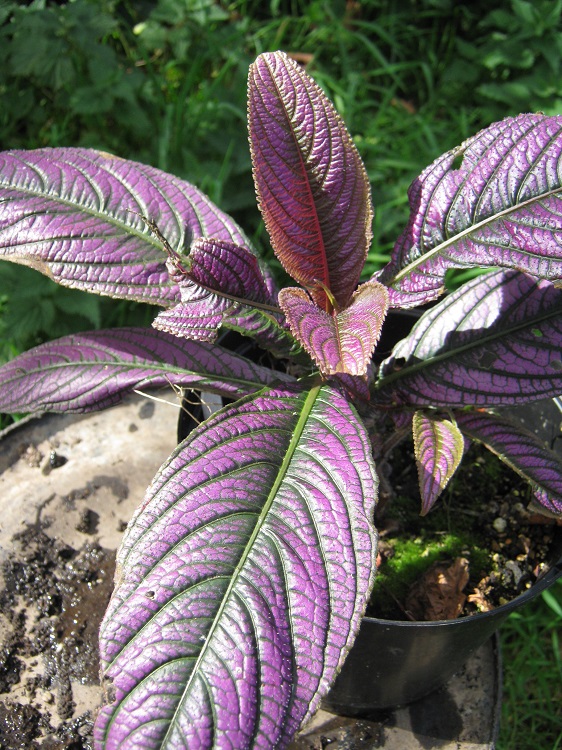 The shining purple leaves are astonishing. The plants grow old and twiggy quite rapidly, and then the leaf size reduces, so it is well worth propagating it regularly. It can get 'toasted' in the greenhouse over winter and I am amazed that it recovers, but we have had two bad winters, and it is still bouncing back and seems to be cheerful. I have never seen it doing the same outside, but I suspect it needs the warmth of the greenhouse to breathe life back into it, and allow enough growth before the winter comes again. I have flowered it several times but never managed to get a decent picture. In the Journal of the Royal Horticultural Society, Ann Bonar wrote in 1980: "As a native of Malaysia, Strobilanthes dyerianus requires a minimum temperature of 10degC (50degF), and plenty of water during summer; if kept dry it is prone to greenfly infestation. It also needs to be kept in good light - but out of direst sun in summer - to maintain the leaf colouring. However, as light can be inadequate in British winters, it is better to renew the plant from easily rooted tip cuttings taken in spring with bottom heat." Plants of the World online has redced the species to S. auriculata var. dyeriana and says: "The native range of this variety is Bangladesh to Thailand. It is a subshrub or shrub and grows primarily in the wet tropical biome." The Missouri Botanic Garden website says: "It is a soft-stemmed, tropical, evergreen shrub or subshrub that is grown primarily for its attractive iridescent purple foliage. It grows 3-4’ tall in frost-free climates, but typically grows 1-3’ in the St. Louis area. Features ovate-lanceolate dark green leaves (to 8” long) that are flushed with silvery-purple iridescence above and dark purple beneath. Spikes of tiny violet 5-lobed funnel-shaped flowers usually do not bloom during the St. Louis growing season, but infrequently may be seen on overwintered plants in greenhouses. Flowers appear in short cone-shaped inflorescences, thus giving rise to the less frequently used common name of Burmuda conehead. " |