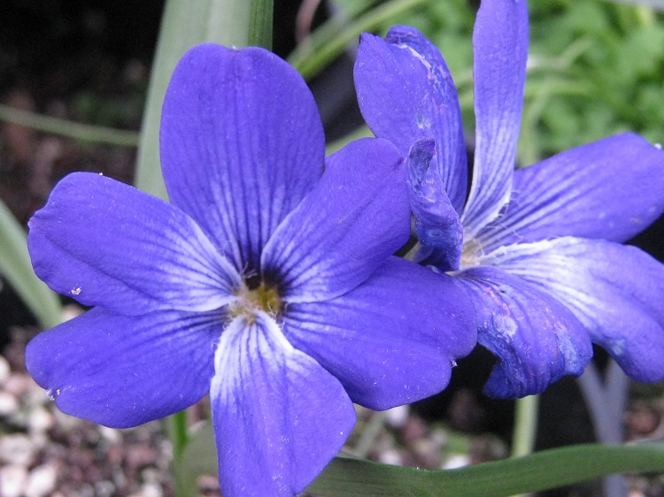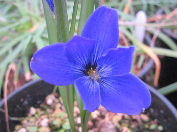 form so wonderful. The plant received a preliminary commendation from the Alpine Garden Society in 1996 when shown by Fred Hunt at the Stirling show. In the bulletin he says: "Together with its fellow versions of the Chilean blue crocus trio, Tecophilaea cyanocrocus and the variety leichtlinii, the purple flowered 'Violacea' is a must for all bulb collections, thereby completing the set for this species. It shares the high price tag of the other two but has not proved difficult to grow. Before the autumn is out, the smallish corms will each have produced two or three narrow, channelled leaves, then in late winter or early spring come the funnel-shaped, 3cm wide deep purple flowers, usually carried singly on rather thready stems up to 10cm long. Although fairly hardy in some areas, it is all the better for the protection of the alpine house, especially in colder regions, as the young shoots in particular are easily nipped by a severe frost. During their summer dormancy, I prefer to keep the corms on the dry side, with only the moisture provided by a damp sand plunge below the alpine house bench to keep them ticking over. They are repotted annually in early autumn, in a compost of John Innes no. 2/3 and enough grit to ensure faultless drainage; on the whole they are treated like most other spring-flowering bulbs, rewarding these efforts without fail six months later. Small offestes are produced by the parent bulbs; these are easily detached and grown on to flower in their third year. Seed is also set, particularly following artificial pollination but, in my experience, germination is somewhat erratic. There are no recent reports of this species in its Chilean homelands: luckily it has taken well to life in exile." In 2002 it was shown at the Edinburgh show, again by Fred Hunt. It was awarded a First Class Certificate. In writing it up in the Bulletin, Robert Rolfe says: "With a garden history of at least 130 years, and numerous records os spactacular successes to counterbalance the litany of failures, this is an indispensable early spring flowering bulb, now available in several versions. Since the sumptuously deep, dusky violet clone to which the award was given is so well-known, and has been discussed at length in quite recent Bulletins, we are content to print the exhibitor's slide of his flower-smothered clump, which was one of the highlights of the Edinburgh show." |