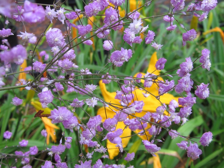 with me instead of growing upright, but perhaps moisture and good soil will encourage it. It hasn't increased greatly in a decade but it has hung on to its space tenaciously. Plant Delights Nursery say: "The airy maidenhair fern-like, deer-resistant foliage of Thalictrum delavayi 'Hewitt's Double' adorns the 4' tall stems which are topped from midsummer through fall with large cloud-like flower heads of small, lavender, pompom-like, double flowers...simply a sensational textural element in the summer garden." It is a plant that has been around for a long time, it is included in the RHS Encyclopedia of Gardening (1951), but I haven't been able to discover its origin so sadly Hewitt is currently lost in the mists of time. I have a vague memory that even when I was a teenager people were unaware of its origin. |