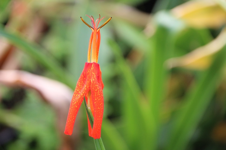 completely terminal. From others experience I would guess that it needs a hot summer and plenty of moisture and food to give a decent display but it hasn't prospered here. Crug Farm Plants say: "With the growing habit similar to the familiar tiger lily, arising from large tear-shaped resting bulbs with fleshy seasonal roots, forming neat fans of upright pleated strap-shaped leaves to 30cm long. But bearing dazzling red orange-yellow flecked flowers that are borne in succession on the terminal spikes just above the foliage for months from mid summer into autumn. Originating from one of our collections found growing in abundance in a Mexican forest on the moist mountains of Oaxaca in 2004 at a lofty 2800m. Easily grown in a moisture retentive but freely drained soil in either sun or shade. Mulch to protect from penetrating frosts in cold areas. (Syn. Rigidella)" |