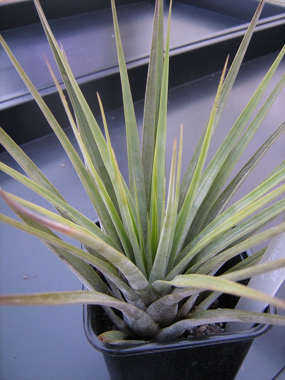 A variable species from Mexico and Honduras. Can form large clusters of rosettes. It didn't like a cold winter, even dry in the greenhouse. Walter Rauh says: "This species is very variable in regard to size, coloration and number of bloom spikes. There are all sorts of transitions between T. concolor and T. fasciculata. From Florida and Mexico to Columbia and Peru; usually epiphytic in dry forests at altitudes of 600-1,900m. Robust, easily grown. Splendid at bloom time. Bloom spikes and their coloration last a long time. Suitable only for larger greenhouses." The Lady Bird Johnson Wildflower Centre says: "An air plant with inconspicuous flowers in the axils of showy bracts, which are usually red. This is the most common air plant (epiphyte), especially on Bald Cypress. Air plants get their nourishment from the air, rain, and minerals leached from the host tree. Among the 15 other erect species of Tillandsia that occur in Florida are Ballmoss (T. recurvata), with narrow leaves forming grayish ball-like clusters on branches of deciduous trees, especially oaks; Needle-leaf Wild Pine (T. setacea), with very narrow, needle-like leaves; T. pruinosa, with a distinctive coat of hoary scales; and Giant Wild Pine (T. utriculata), the largest species in the United States, with leaves reaching 2 feet (60 cm) in length and a flowerstalk up to 6 feet (1.8 m) tall." |