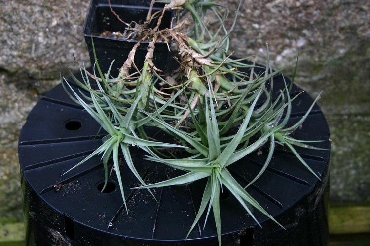 The majority of Tillandsias are extremely tender, with broad green leaves. The grey leaved Tillandsia grow epiphytically, or lithophytically, or telegraphwire-ophytically, and are drought tolerant, and neglect tolerant. This one has never had a root ball, and grows out of an empty pot. It seems to prosper in its own slow fashion. When it did finally flower, it was spectacular. I think it was responding to an increase in light levels after I moved it into a poly tunnel. My plant came labelled as T. recurvata and although I have some misgivings, I m not going to change it yet. Matt Candeias says on his 'In defense of plants' blog: "Tillandsia recurvata is native throughout an impressive chunk of the Americas, from the southern United States through to northern Argentina and Chile. Wherever temperatures rarely dip below freezing, T. recurvata can make an easy living. One of the most remarkable aspects of this species is the array of habitat types in which it grows. This hardy little air plant is equally at home in sub-tropical conditions as it is arid desert habitats. Its ability to tolerate heat, drought, and plenty of air pollution has led to its colonization of urban environments as well. Probably the most incredible feat of this species has been its conquest of the human environment. Throughout its range you can find T. recurvata thriving on man-made structures like power lines. " |