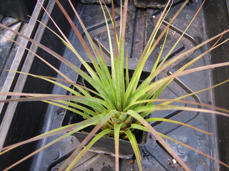 and when I finally went to rescue it, it was too late to save). This young plant seems to be growing slowly into a replacement. Andy's Airplants says: "Tillandsia tricolor v. melanocrater is a great species of Tillandsia it is easy to grow, it does not require the air-movement that the silver leaved species enjoy, making it very suitable for windowsills, bathrooms and terrariums. It will also grow well in bright conditions with a regular wetting. The plant responds well to being mounted or grown in a pot with just potting bark as a medium. Tillandsia tricolor comes from Central America and Mexico where it grows as an epiphyte on trees. It has dark green leaves that can color up very nicely if given high light levels. The flower spike is impressive too with red yellow and green stem and bracts, the flowers are puple and tubular." Tillandsia tricolor var. melanocrater has now been elevated to species status, as Tillandsia melanocrater, however people are not adapting rapidly and for the moment I am going to leave things as they are. |