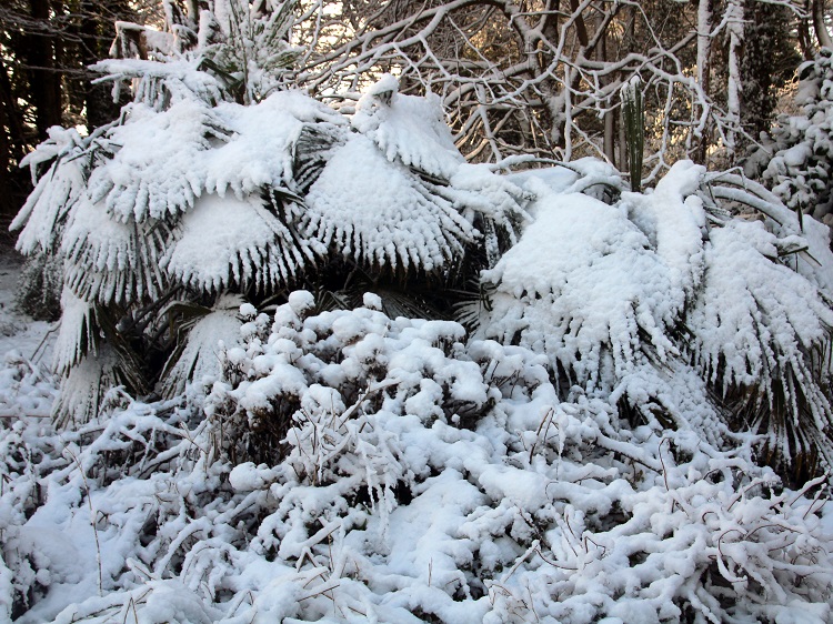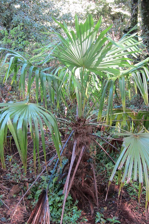 and planted in a pot, but palms have compact root systems and are are quite forgiving. It has taken a long time, but I am finally ready to take it from its pot and plant it out. It hasn't grown very significantly during the potted years but it has survived. The new situation is rather windy but there is a good deep rich soil so it should get away with enthusiasm. It has grown well now it has settled, I had to add a wire guard to keep the rabbits away. There is a smaller plant nearby that they have chewed down to a stump. Trees and Shrubs online says: "T. fortunei is widespread in central and southern China, but has so long been cultivated for its fibre, and naturalises itself so readily, that its original habitat is uncertain. It is not a native of Japan, but there too it was an important economic plant, and the first seeds to reach Europe were sent from that country by Siebold to Leyden in 1830. Although the Chusan palm is perfectly hardy in the south and west of Britain, in so far as it will, when properly established, withstand a temperature of 32° F or more of frost, it likes a spot screened from the north and east winds." |