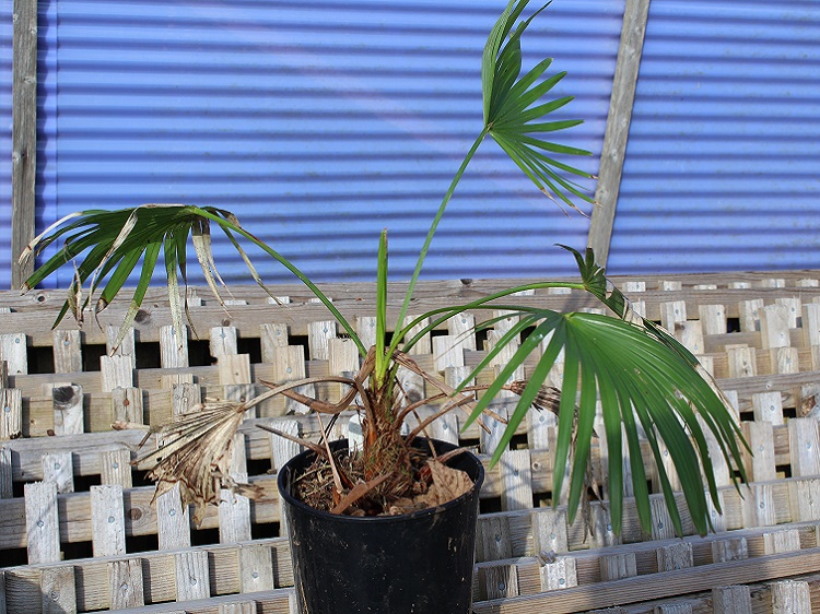 Still a young seedling I got from David Constantine at KobaKoba. I am hoping that this will be as useful in the garden as Trachycarpus fortunei (eventually)! It is growing slowly in a pot, but I think it would do far better in the ground. The species was discovered in the early 1990's, growing on sheer cliffs in the Stonegate Gorge, Yunnan. There are both blue leaved and green leaved forms in cultivation. The green leaved forms seem to originate as seed from the cliffside plants, the blue leaved plants are grown from seed of plants growing nearby. Hardy Palms say: "The most beautiful and sought after of the genus with its slight blue leaf colouration contrasted by a stunning white underside. Somewhat difficult to grow but well worth the effort." The Palm Centre says: "The chance finding of a single line in an old Chinese plant book led Martin Gibbons and Tobias Spanner on several expeditions to southwestern China, discovering what was thought by the author to be Trachycarpus martianus was actually an unidentified, distinguishable species. Along the banks of the Nujiang, on two almost vertical bare marble cliffs of the Stone Gate, Trachycarpus princeps was discovered and, over several expeditions, eventually brought into cultivation in the UK and Europe." |