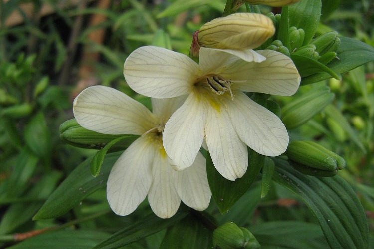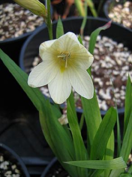 a large clump of dying leaves. Previously recorded as a form of T. linearis but this is a synonym of T. gladiolaris. I got it from Desirable Plants and the label reads: "Winter growing form of this variable sp, lovely large cream flowers in May. 30cm. Sun, good drainage, suits pots. Smr dormant corms." The Pacific Bulb Society says: "Tritonia gladiolaris (Lam.) Goldblatt & J.C.Manning, syn. Tritonia lineata (Salisb.) Ker Gawl., grows in grassland in the southeastern Cape, about 60 cm high. It has creamy white or pale yellow or orange funnel shaped flowers with dark veins. This plant copes with a Mediterranean growing cycle even though it is a summer rainfall species, but I wouldn't say it thrives. When grown with regular summer water it expands rapidly. When grown with a dry summer, it merely survives or dies." |