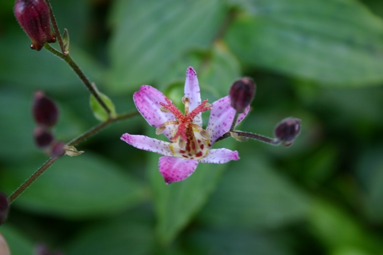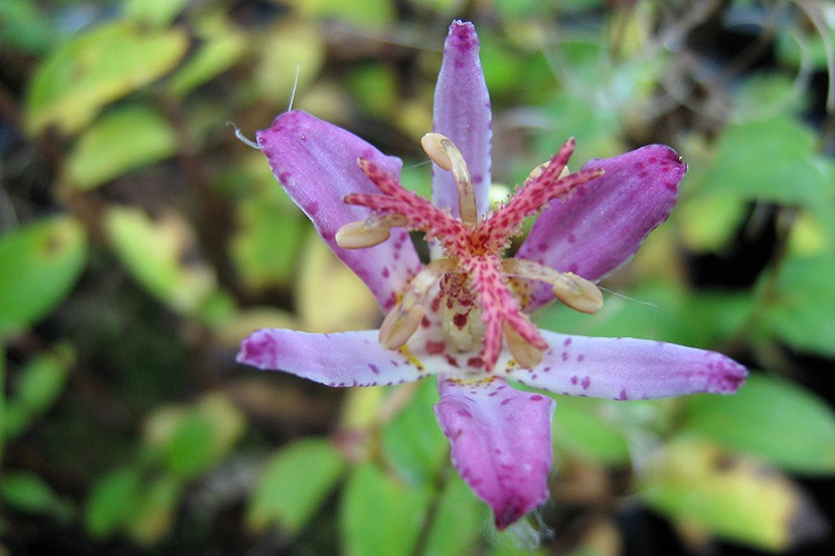 and seems to have been distributed by Broadleigh Gardens from 1992. Tricyrtis cultivars are monsterously confused. In 2002 Viv Marsh Postal Plants said: "A more open flower, with narrower petals of white, dappled with blue" A description from Tropical Britain says: "Tricyrtis formosana 'Adbane' - sometimes referred to as Tricyrtis formosana 'Taiwan Adbane' - is an exceptional cultivar of Tricyrtis formosana with exquisite speckled lilac flowers that typically have a tinge of blue at the end of the tepals. The throat is a pale yellow. The female parts are impressive and eye-catching with a style that is large and also speckled and the ornate stigmatic lobes are a beautiful contrasting ochrous-red and are split at the ends." In an article in 'Pacific Horticulture', Dan Heims says: "Tricyrtis ‘Adbane’ produces dark green foliage with purple tinting on two-foot stems. The mauve blue flowers have white centers." It is unfortunately the case with toad lilies that if you look hard enough online you will find a description of any cultivar to suit your preconceptions. However, I take 'Adbane' to show reduced spotting on the flowers, resticted to the base of the tepals, and a tendancy to blue colour mixed in with the rose-purple tips. |