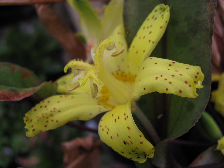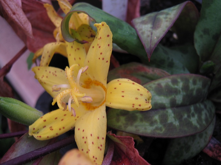 A good, dwarf, yellow flowered species from Japan with compact growth and large flowers. Plants of the World online says: "The native range of this species is Japan (Kyushu: Miyazaki Pref.). It is a perennial and grows primarily in the temperate biome." Plant Delights say: "Tricyrtis flava is a rare "vulnerable" Japanese endemic toad lily species that is without a doubt one of the finest members of the genus, and certainly one of the least known. The foliage emerges in spring with dramatic dark purple spotting, that soon ages to dark green, before disappearing in the heat of summer. In early fall, the short, compact clumps are topped with clusters of quarter-sized clear yellow, upward-facing flowers, each held above the foliage by a 4" stem. A mass of Tricyrtis flava in the woodland garden is just like a bowl of good ice cream.... indescribable!" |