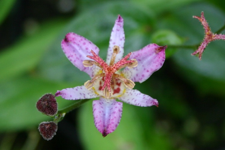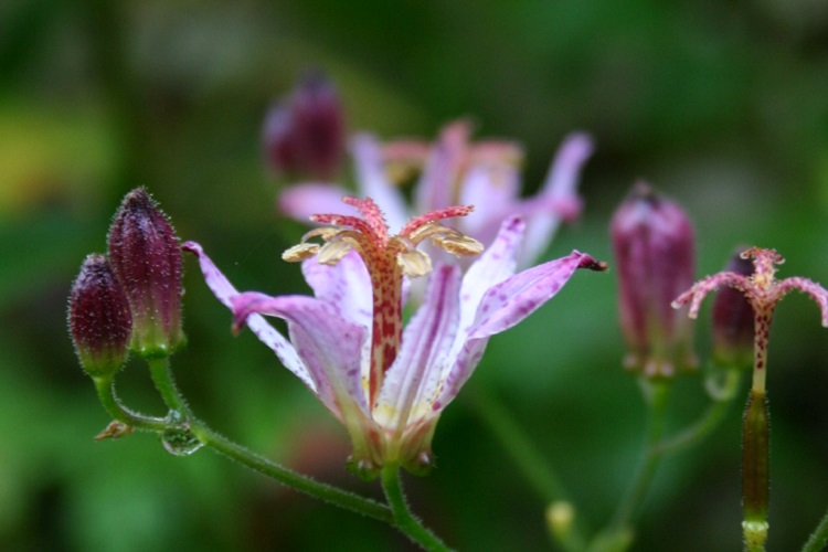 I have seen in other gardens seem to be the same thing. In a letter to the RHS in 1997 Barry Yinger says: "The article 'Tricyrtis at Rosemoor' (The Garden September 1996, pp536-9) perpetuates a common error. There is no cultivar of Tricyrtis correctly bearing the name 'Hototogisu'. this word is the general colloquial Japanese name for Tricyrtis and is invalid as a cultivar name. The plant named in the article is, I believe, the Japanese hybrid cultivar 'Seiryu'." Pan Global Plants say: "An erect Japanese perennial best suited to reasonably moist soil in partial to full shade, with foliage spotted when young. The 75cm stems are topped with complex pale-mauve, lightly speckled flowers in late summer. Hardy. Hototogisu is the Japanese name for the Lesser Cuckoo, though some other nurseries in the UK will try and tell you different!" There is room for both to be correct. Wikipedia says: "Tricyrtis hirta (Hototogisu-sou), the toad lily or hairy toad lily, is a Japanese species of hardy herbaceous perennial plant in the lily family Liliaceae." |