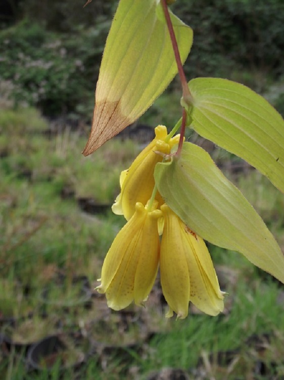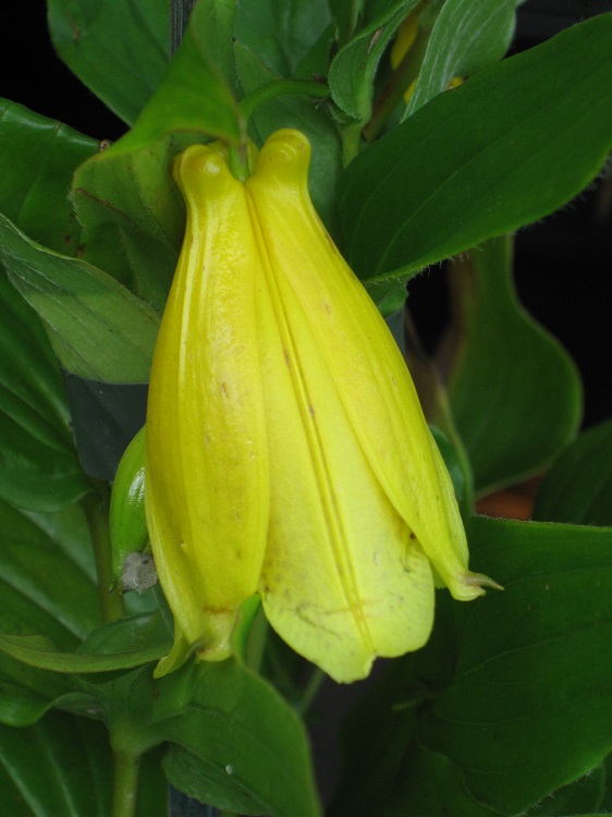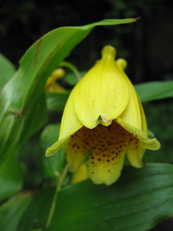 which is rare in cultivation. Bright glossy leaves on long arching stems. Plants of the World online says: "The native range of this species is Central Japan (Kii Peninsula). It is a perennial and grows primarily in the temperate biome." Writing in the JRHS in 1982, Roy Lancaster says: "At the Great Autumn Show on 23rd September 1980, however, an Award of Merit was given to the Japanese T. macranthopsis, a very different 'kettle of fish' from the normal run. In fact, by coincidence two plants were submitted for award, one by Mr. B. Mathew of Weybridge, Surrey, and another by Mrs K. N. Dryden of Sawbridgeworth, Hertfordshire. Grown in pots the plants had slender brownish ghreen arching shoots to 12in. long (30cm) bearing handsomely ribbed, lance-shaped leaves to 3 to 3 1/2in. long (8cm), clasping the shoot at their base. The pendulous bell shaped flowers 1 3/4 to 2in. long (5cm) were borne singly on slender stalks from the leaf axils. The three outer segments were recurved at the tip with a horn-like point and posessed a pouched nectary at the base. In colour they were lemon-rind yellow beautifully spotted red within. It seemed to me from the habit of the plants exhibited that it would grow naturally and look most at home on a woodland bank and I was interested to note that the growers recommended it for a semi-shady soil on the shady rock garden or for the alpine house. In the wild T. macranthopsis is found on shade cliff faces and this should be borne in mind when siting it in the garden." |