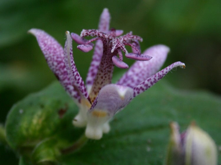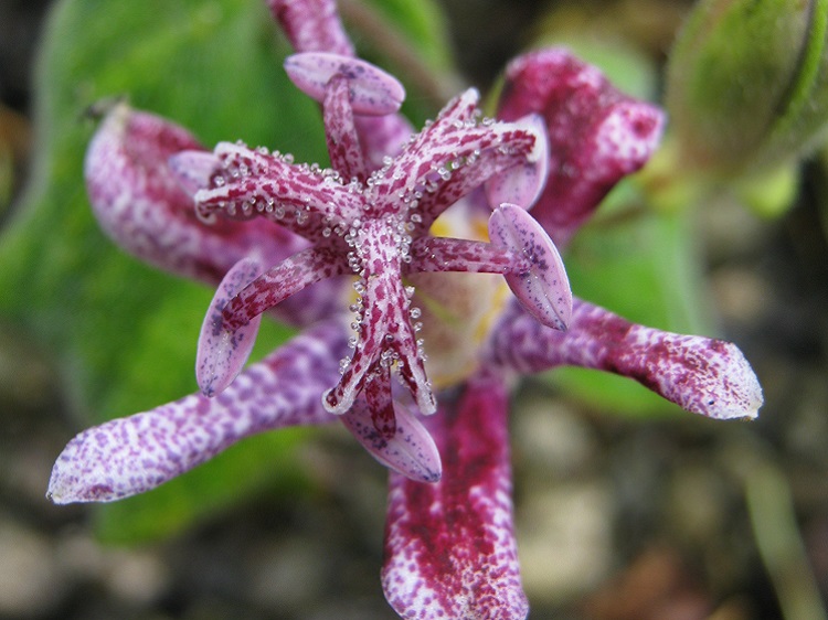 and their label says: "New Toadlily. This form has purple-pink flowers with darker spots. Flowers September - October. Shade 70cm." Writing on Dave's Garden in 2008, Tamara Galbraith said: "Another problem with toad lilies that has recently been discovered is Tricyrtis Floral Virus. The disease seems to have spread from the Tricyrtis 'Raspberry Mousse' hybrid, and can cause an unusual blotchy color to develop in infected plants, mostly the purple-flowered types." Promesse de Fleurs say: "A superb selection with burgundy red flowers punctuated with white spots. This Japanese perennial, with a very exotic appearance, is nonetheless a sturdy and hardy species that displays a unique and delightful flowering in the freshness of the undergrowth. Its flowers, resembling small speckled lilies, appear in late summer, carried by flexible stems adorned with beautiful glossy leaves. Very long-lasting in humus-rich and moist soil." |