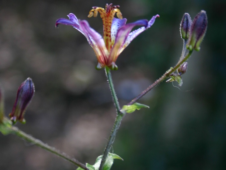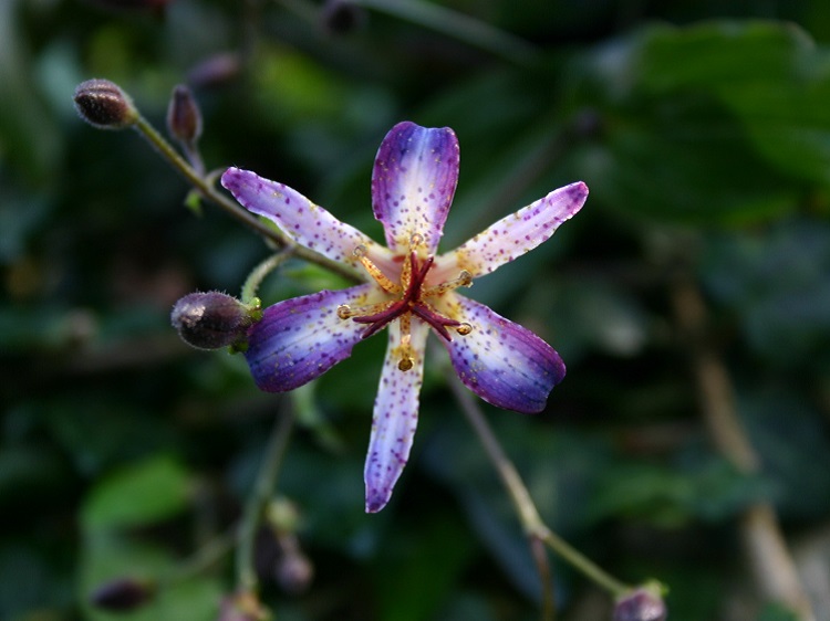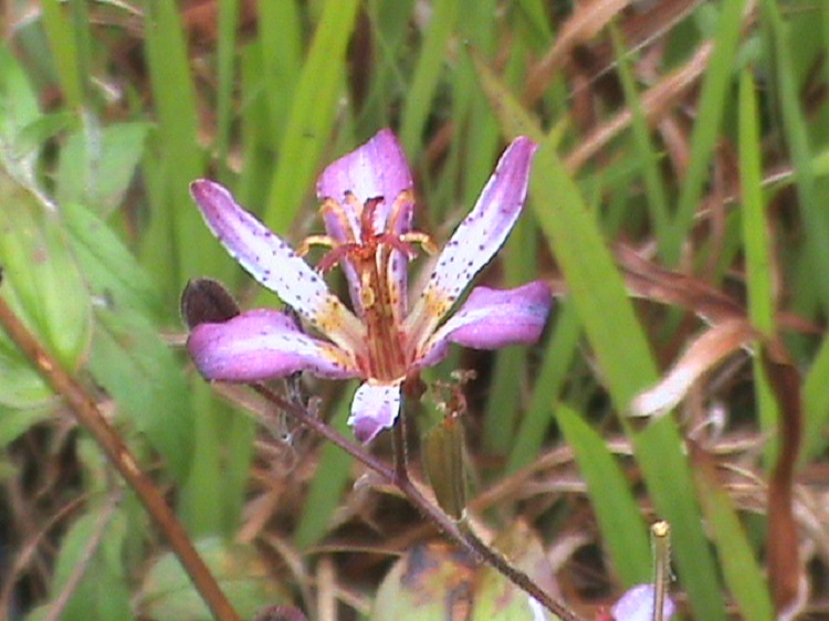 I selected this from a commercial batch of 'Taipei Silk' because of its very blue flowers (they should be pink). Bought from a garden centre but grown by Blooms Wholesale. I am still waiting to see if it will repeat the effect. Plant Delights Nursery say: "Tricyrtis 'Taipei Silk' is a delightful 2005 tricyrtis hybrid from the breeding program of Darrell Probst. The 30" tall stalks of this Tricyrtis lasiocarpa hybrid are clothed with glossy green leaves, then topped, starting in September, with five-way branched terminal sprays of 1.5" wide flowers. Each flower is composed of three rich lavender petals contrasted with three smaller white petals with lavender specks. Tricyrtis 'Taipei Silk' is a great addition to the fall garden." Protected by Plant Patent PP18,727. The patent says: "The new Tricyrtis originated from a cross-pollination made by the Inventor in 1992 in Hubbardston, Mass. of an unnamed selection of Tricyrtis formosana, not patented, as the female, or seed, parent with an unnamed selection of Tricyrtis lasiocarpa, not patented, as the male, or pollen, parent. The new Tricyrtis was discovered and selected by the Inventor in 1993 as a flowering plant within the progeny of the stated cross-pollination in a controlled environment in Hubbardston, Mass." |