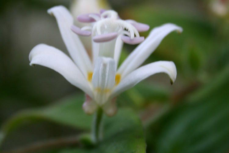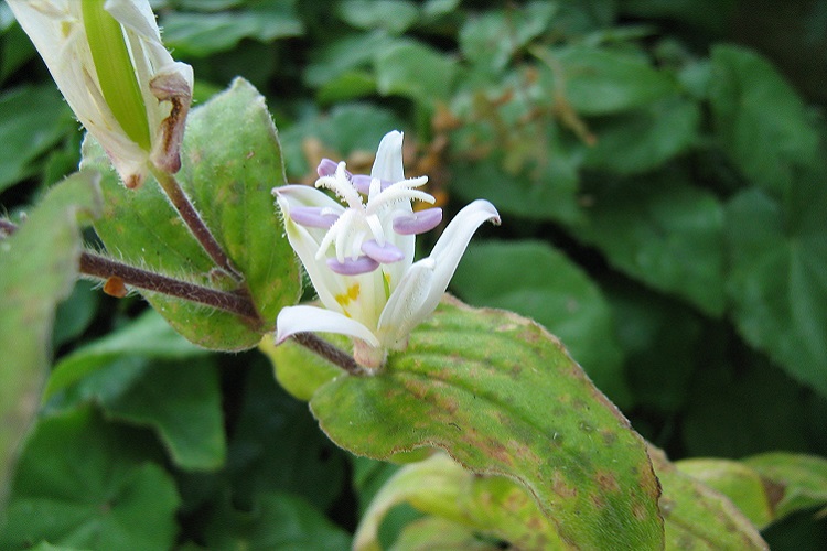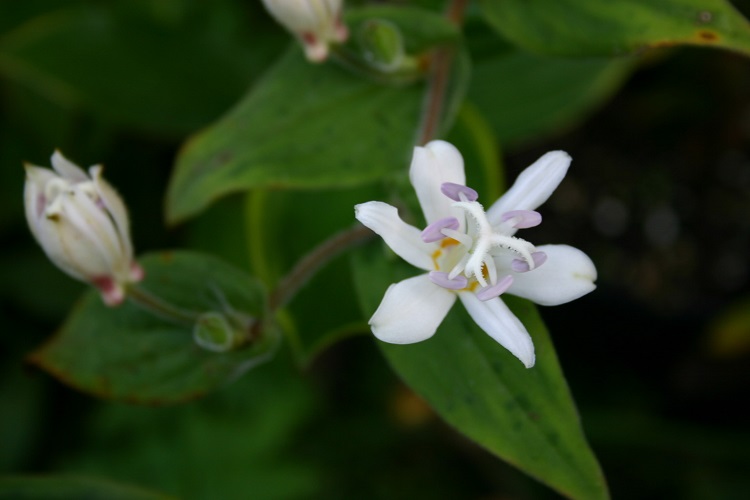 this is one of the most elegant and garden worthy of the modern hybrids. Missouri Botanical Gardsen says: "'White Towers' is a compact, clump-forming cultivar that typically grows 16-30" tall on upright-arching stems and features small, pure white, lily-like flowers (1 inch long) and broadly ovate, stem-clasping, shiny, medium green leaves (to 4-6" long). Flowers bloom in the upper leaf axils and stem ends in late summer. Flowers bloom earlier (July-August in St. Louis) than most other toad lilies. Each flower has six showy tepals (similar appearing sepals and petals). 'White Towers' is varyingly sold as a cultivar of T. latifolia or T. hirta or as a hybrid." Farmyard Nurseries say: "A good pure white hybrid of this rather exotic looking plant. The starry flowers are borne in tall upright sprays during late summer and autumn. Prefers a semi shaded peaty soil. Good for woodland sites. One of the best of the whites. Height and spread 45-60cm (1.5-2′)" |