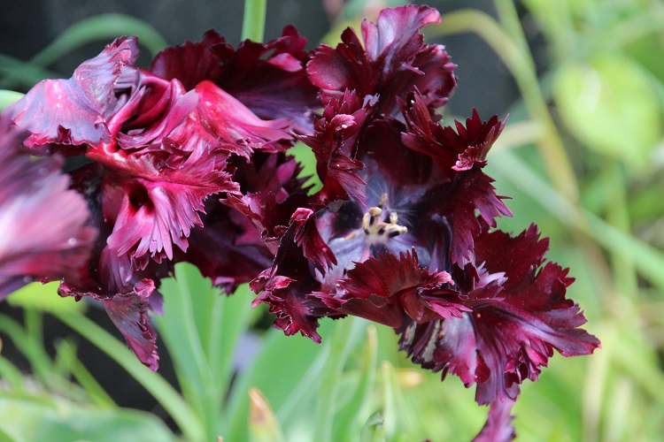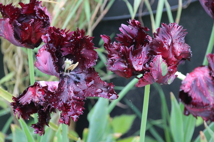 A spectacular dark flowered cultivar. I bought them from a garden centre and grew them for a year for effect. Registered by K.Keur and sons in 1937, the KAVB register says: "Exterior deep purple; inside blackish purple." J. Parkers say: "This deeply coloured cultivar boasts large, flared heads with intricately feathered edges. Each petal twists and turns artistically, boasting a rich and velvety black. Tulip Black Parrot is hard to ignore and sure to impress through spring. Each flower head sits on a tall sturdy stem, surrounded by lance-shaped foliage. Tulips like to be planted late in October and November with the colder weather." |