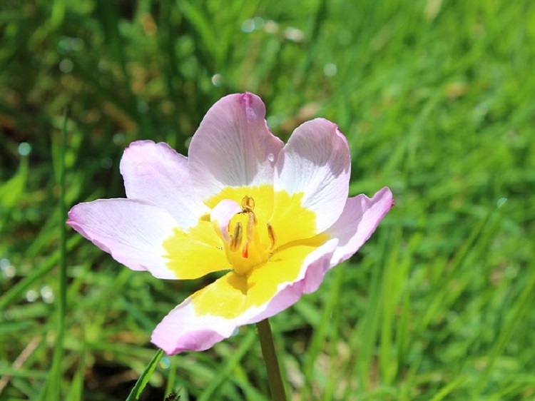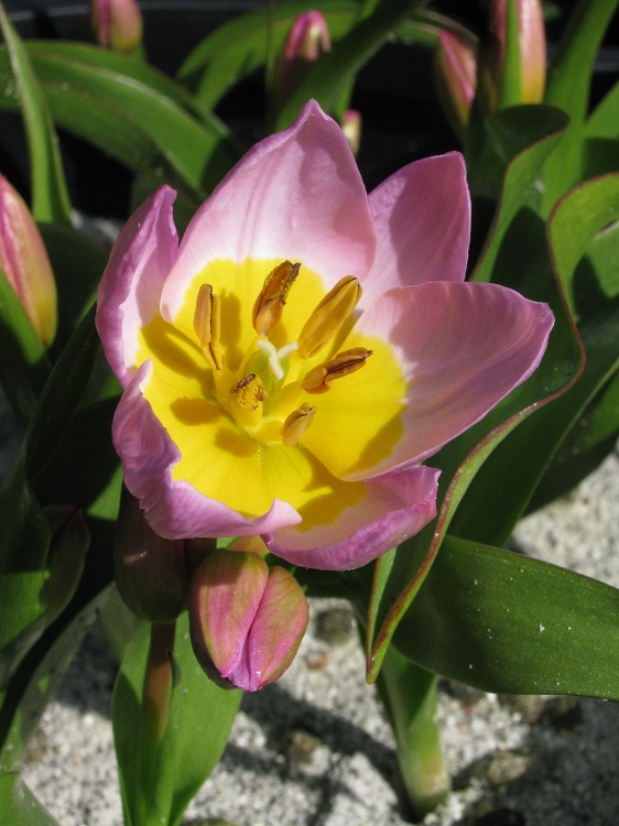 A soft lilac-pink cultivar, probably a selection of T. bakeri. It has been the longest lasting tulip in the open garden here. Registered by Visser Czn in 1971. The tulip register says: " Exterior light roseine purple, inner tepals somewhat lighter, outer base pale yellow; inside pastel mauve, large circular lemon yellow base, anthers yellow." Beth Chatto Gardens say: "One of the first tulips to emerge, with broad, glossy, vibrant green leaves. In spring, the lilac-pink flowers, with a broad buttery-yellow central zone, are wide open to the sun. Can spread by stolons. Found on the island of Crete." |