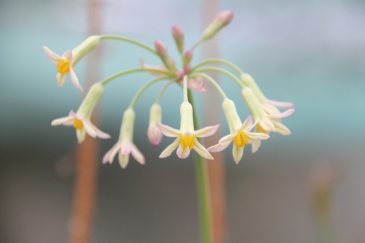 it has now been named 'Bob Brown'. Cotswold Garden Flowers suggest that it is Tulbagia (violacea x cepacea). I got it from Desirable Plants and their label said: "Tulbaghia new var. 5. (?violacea x cernua) Purple-green flowers with yellow coronas in late spring. Ht 40cm. Evergreen and free-flowering. Sun, not too cold." |