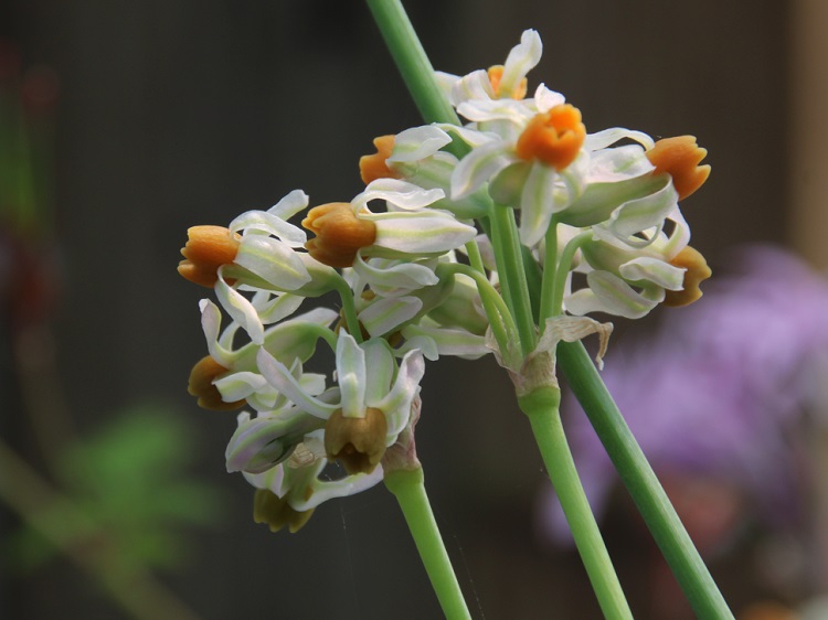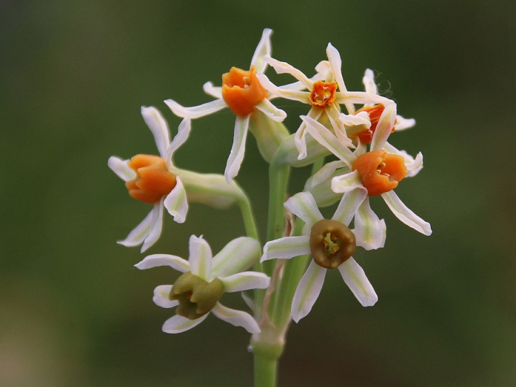 the corona is too large and "bulbous". The label from Tale Valley Nursery says: "Tufted clumps of narrow bright green foliage with small highly scented white flowers with yellow-green centres from early summer to autumn. Scented. Best grown with winter protection." |