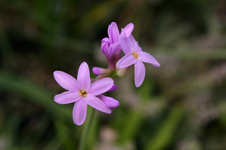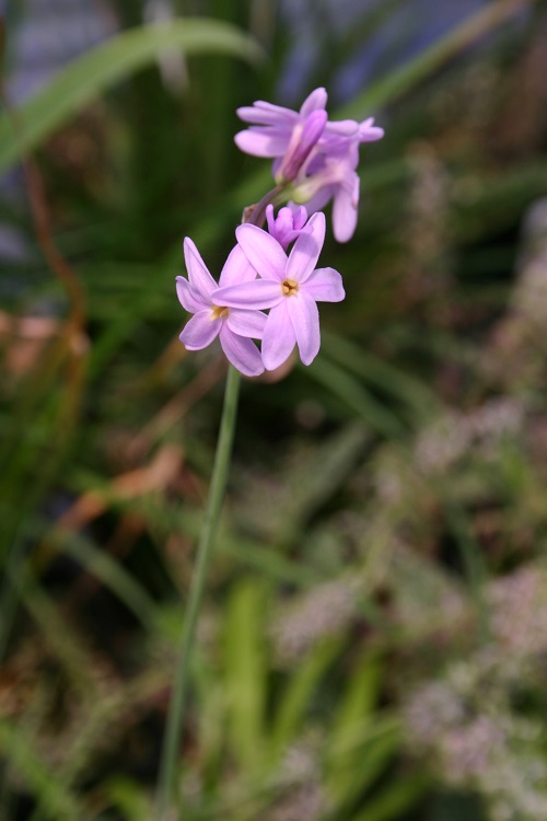 tufts of onion scented leaves. There are a great many forms and names in cultivation, this pink one seems fairy typical of the species. Stephen Benham says: "Probably the most widely grown species of the genus, it is relatively hardy, producing a long succession of slightly fragrant flowers from August until October making a charming show when massed. The whole plant has a strong onion odour making it somewhat unpopular to grow and handle. In a profile about AGM plants in the Journal of the RHS, Christine Skelmersdale writes: "This is the hardiest member of this genus of attractive South African rhizomatous perennials. Although the individual flowers may not ne showy, Tulbaghia violacea rewards the gardener with am almost unbroken and generous display od small umbels of lilac-pink tubular flowers all summer. Regular deadheading will encourage this. While the narrow leaves smell of garlic if crushed, the dainty flowers are lightly scented. It requires a well-drained soil in full sun, and makes an excellent and trouble-free pan (shallow pot) plant. Propagate by splitting the clumps in spring." |