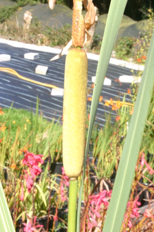 "Typha latifolia variegata is the variegated cultivar of greater reed mace and is a godsend, since it is far less vigorous than the plain green species and the strong white and green variegation lasts all season.