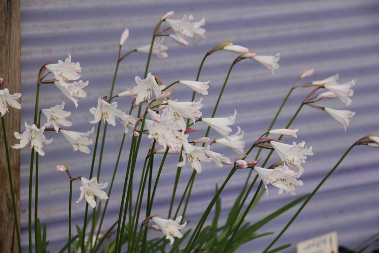 Between the two great flushes of flower, Nerine pudica takes centre stage. It is pale and delicate, without the stormy rainbow