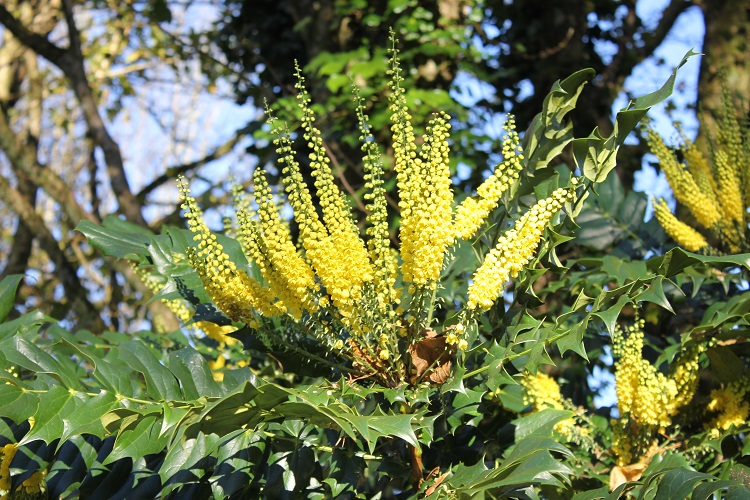 Fortunately the low sun beamed in under the skirts of the pine trees at the end of the week. It didn't become warm, but it appeared warm and that was enough for the Mahonia.