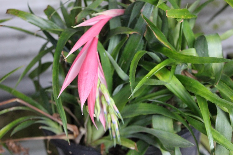 Billbergia x windii has celebrated the new liberation by producing an unseasonal flower to dangle in the unexpected space. It doesn't like to get too wet so it comes into the shed for the winter.