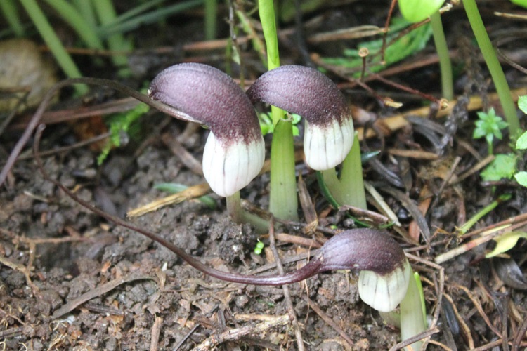 The leaves of Arisarum proboscideum have been pushing through the ground far a few weeks. I pulled a few off to reveal the maturing flowers.