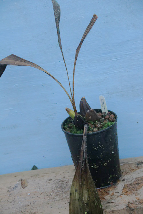 I bought it because I adore the green flowers of Ida locusta and thought that it had some chance of cold tolerance. Plants of the World online says: "The native range of this species is W. South America. It is a pseudobulbous geophyte and grows primarily in the wet tropical biome." The Internet Orchid Species Encyclopedia says: "A medium sized, cold to warm growing epiphytic or lithophytic species found in Colombia, Peru, Bolivia and Ecuador at elevations of 1000 to 2800 meters under scrub in rocky soil with shady conditions and, in river canyons and on decaying tree stumps, with ovoid pseudobulbs carrying 2 deciduous leaves that blooms in the later winter and early spring on a laxly erect, several at once, to 4" [10 cm] long inflorescence with nocturnally fragrant, waxy, long-lived flowers." La Foresta Orchids say: "Sudamerlycaste are endemic to Peru. It is a mountain species, it is at an altitude of 2000 - 3000m and grows on the limestone rocks or on the trunks of trees along the rivers." Unfortunatley I had an unusually severe radiation frost in the middle of December that completely destroyed it. I don't think that it would have been tough enough to survive in the greenhouse under normal circumstances but a sudden, severe frost so early in the season was clearly too much. |