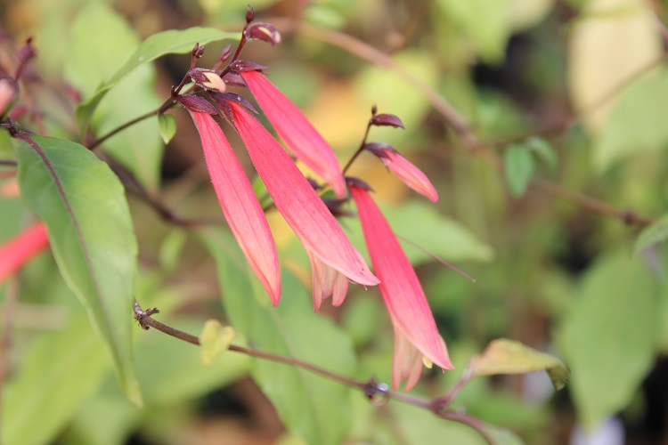 "Tender evergreen shrub with vivid orange-red tubular flowers for a long period in winter.