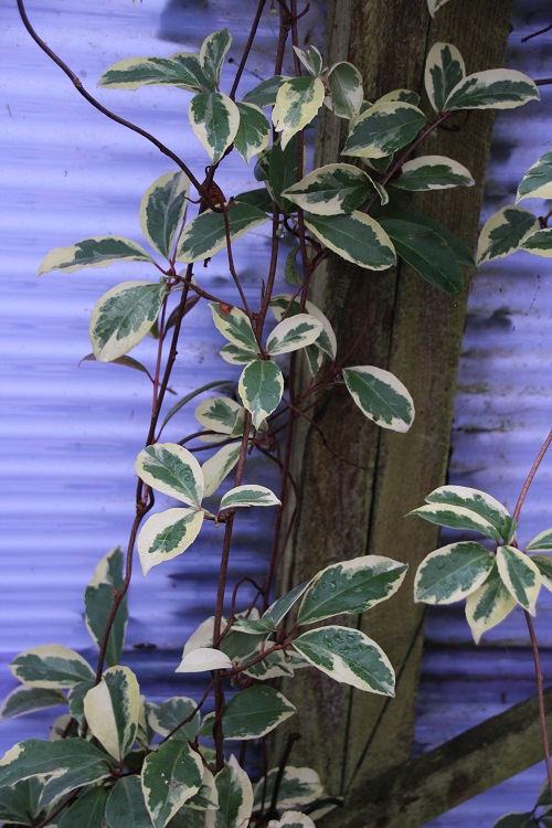 A climber from China and Japan with broad evergreen leaves. It isn't particularly hardy although I think the green leaved form should survive here growing into a suitably protective tree.