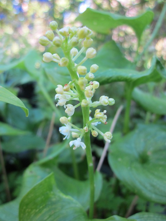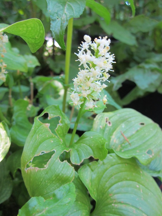 A vigorous low creeping plant, with fluffy spikes of white flowers in May. Good ground cover in dappled shade. If I am going to be brutally honest, it suffers from the same affliction as the grasses that have recently become so trendy. It makes a really good subject for photographs , but all the pretty photographs of detail are not enough to make it into more than just convenient garden filler. I bought it from Southcombe Gardens, their label said: "Low mat. Small fluffy white flowers in spikes up stems to 1ft. Cool humusy soil. Easiest in dappled shade." Writing about Mallet Court Nursery in the Journal of the Royal Horticultural Society, Arthur Hellyer said: "Maianthemum dilatatum also came from Ullung Do and Gordon described with delight seeing its red berries 'dancing in the sunlight'. This pretty herbaceous carpeter is closely related to M. bifolium, a rare British native, and some botanists regard it as an Asiatic form of that species." Plants of the World online says: "The native range of this species is Mongolia to Japan, Alaska to NW. California. It is a rhizomatous geophyte and grows primarily in the temperate biome." The California Native Plant Society says on its Calscape website: "Maianthemum dilatatum (Two-leaved Solomon's Seal or False Lily of the Valley) is a common rhizomatous perennial flowering plant in the Ruscaceae Butcher's Broom) family. It is native to western North America from northern California to the Aleutian islands, and Asia across the Kamchatka Peninsula, Japan, and Korea. It grows in coastal temperate rainforests, and is often the dominant groundcover plant in Sitka Spruce forests. The plant produces an erect, unbranched stem up to about 40 centimeters tall. A non-flowering shoot bears one smooth, waxy, shiny leaf up to 10 centimeters long and 5 to 8 broad, hence its scientific name (dilatatum means 'broad'). On plants that are flowering, 2 or 3 leaves are produced oppositely on the stems. The leaf is oval in shape with a heart-shaped base. Although it can be a vigorous spreader where conditions are right (shady and damp), it makes a good groundcover for shady northern gardens." | |