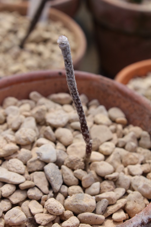 The thin shoot from the ground will eventually swell at the end into a typical cactus body. The Llifle encyclopedia says: "It is a restricted micro-endemic species scattered in small populations in the municipalities of Aramberri, Doctor Arroyo and Mier y Noriega in the state of Nuevo Leon (Mexico)(extent of occurrence less than 5,000 km2) Altitude: Around 1400-1700 metres above sea level. This Turbinicarpus grows in low xerophytic shrubland on shallow slopes and in calcareous and gypsum soils together with Pelecyphora strobiliformis, Pelecyphora pseudopectinata v. rubriflora, Thelocactus hexaedrophorus, Ferocactus steinesii, Glandulicactus uncinatus, Coryphantha bergeriana, and Echinocereus pectinatus. It is endangered because it has a relatively restricted range, occurs in five locations, and it is sought after by collectors who cause a continuing decline in the population." |