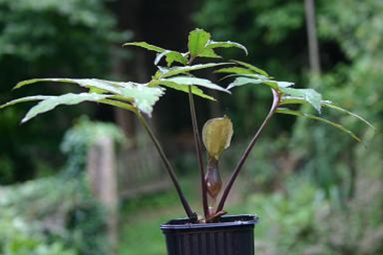 it stopped at 6", and then flowered. I have it in the conservatory, so I am not sure how hardy it will be. It grew so easily, that I hoped it would winter without problems if kept dry, but unfortunately it was never seen again. I was surprised to be able to replace the plant in 2008, and I hope that I can keep it alive this time. Plants of the World online says: "The native range of this species is W. India, W. Himalaya, Assam to S. China and Indo-China, Sumatera to Lesser Sunda Islands (Bali). It is a tuberous geophyte and grows primarily in the wet tropical biome." Farmyard Nursery says: "A small, surprisingly fast spreading species with short reddish stems topped by radial, velvet textured leaves divided into narrow leaflets. Small fawn coloured spotted spathes, that are rather smelly, are borne during the early summer. Seems reasonably hardy in a sheltered place. Sun or semi shade. Height 15cm (6″)." |