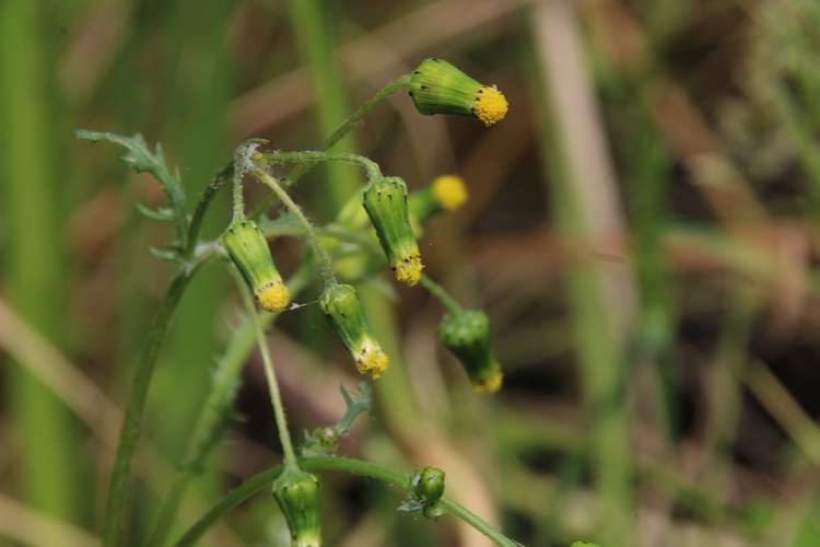 establish here I would yank it out and stamp the life from its stinking stems, but it won't. Too wet. Plants of the World online says: "The native range of this species is Macaronesia, Europe to China and Arabian Peninsula. It is an annual and grows primarily in the temperate biome. It is used to treat unspecified medicinal disorders, as a poison and a medicine and for food." The Wildlife Trusts online say: "Groundsel is an annual weed of cultivated or disturbed ground, popping up along field edges, roadside verges and on waste ground. Branched stems lead to open clusters of yellow flowers that can be seen most of the year, and turn to white, fluffy seed heads. It is these seed heads that led to its Latin name, Senecio, derived from the word for 'old man' - pull the white, fluffy seeds from the flower head and they leave behind a bare, dotted 'scalp'". The University of Wisconsin-Madison says: " The origin of the common name is a derivation of the Anglo-Saxon groundeswelge, meaning ‘ground swallower,’ referring to how rapidly the weed spreads. It is a fairly inconspicuous little plant that is easily overlooked. |