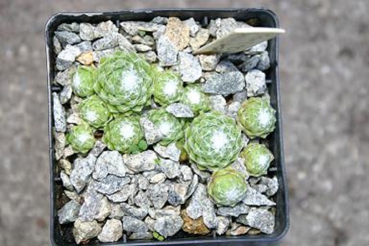 A particularly white and woolly cultivar that I bought from Trecanna Nursery. Raised by André Smits in Belgium in 1997. Howard and Sally Wills say: "Small pale green rosettes with a dense, pure white cobweb in summer." |